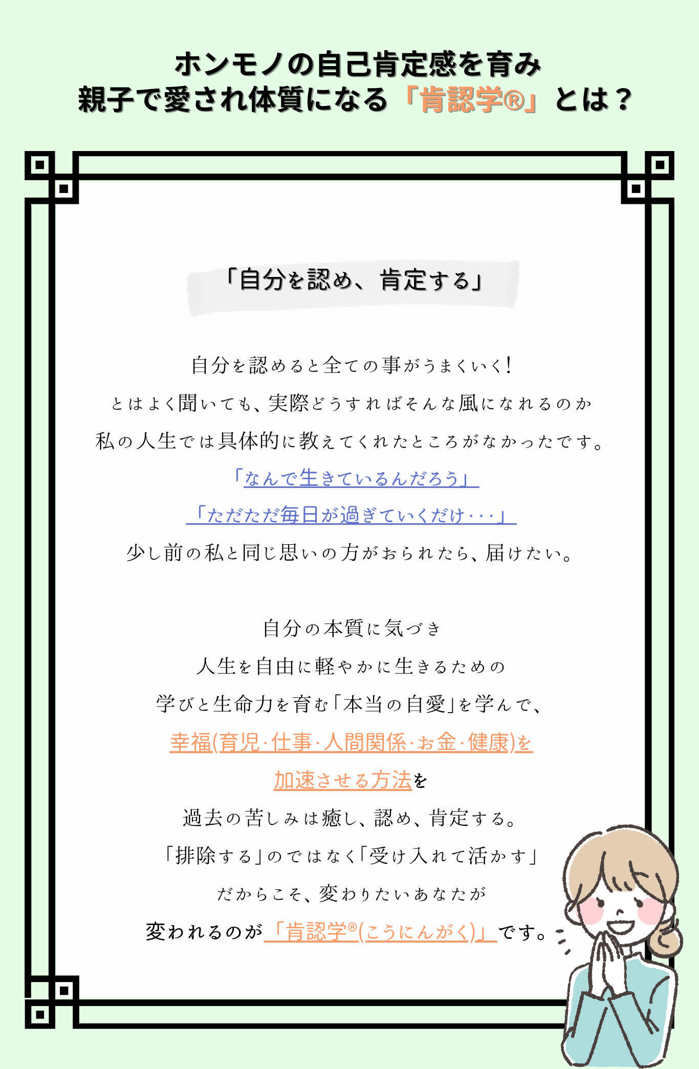 肯認学に出会った頃、私は人のために頑張りすぎて心も体も限界でした。アトピーが悪化し、動くことさえ苦しい毎日。けれど学びを通して少しずつ心が癒され、今では優しい人たちに囲まれ、穏やかな毎日を送っています。無理をせず自分のペースで働いても、会社の売上は上がり、お給料も安定しました。体も元気を取り戻し、若い頃よりも充実しています。自分への愛と人への愛のバランスが整うと、人生そのものが優しく変わると実感しています。